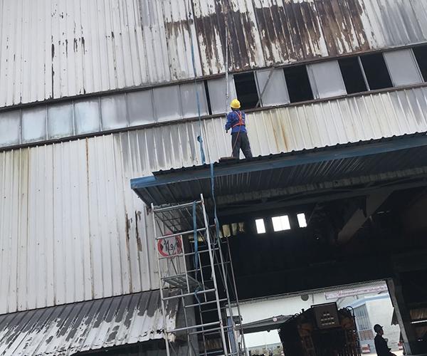 电解车间立面(整体彩钢屋面):清理干净后,先用转换底漆喷涂除锈,待24小时恢复铁板原样。然后用铆钉固定屋面大板,清除锈板板面破损严重边棱,接头可切割掉,根据旧板型号换上新板(0.55mm厚宝钢板)固定牢固后用硅胶刷边沿至缝实。